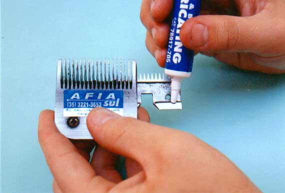 | Colocar as superfícies de corte no seu lugar. Colocar a lâmina na tosquiadeira. Ligar a máquina e usar o lubrificante Oster kool Lube® sobre os dentes da lâmina. Isto proporcionará a lubrificação necessária aos dentes. Quando estiver cortando pêlo sujo ou enrolado, como caso de um cachorro, deve-se limpar a lâmina freqüentemente seguindo os passos indicados nas ilustrações de 1 a 5 para impedir o desgaste excessivo das lâminas. | Ilustração 5 – Não por óleo nos dentes da lâmina, só nos canaletes. |